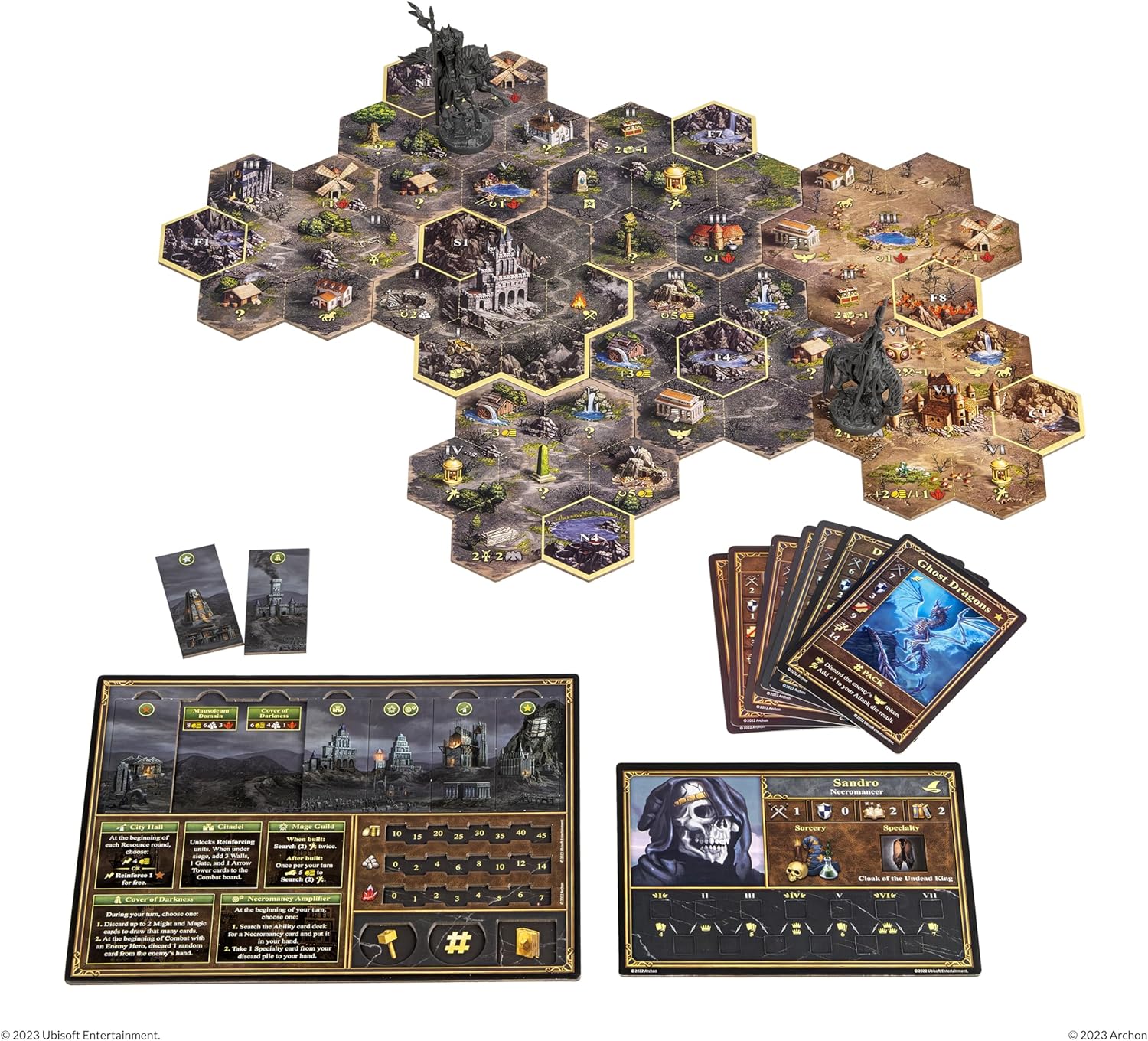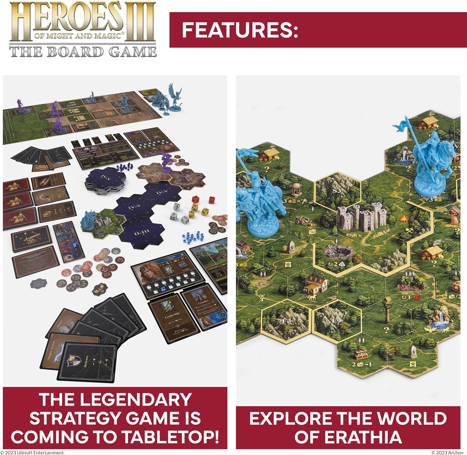 Heroes of Might & Magic III: The Board Game es un juego de estrategia impulsado por la aventura para 1-3 jugadores ambientado en un universo de fantasía de culto. El juego incluye escenarios competitivos, cooperativos y en solitario para luchar y explorar tu camino. Los mapas de aventura están representados por azulejos, y cada azulejo se divide en siete campos hexagonales. Juega una variedad de escenarios variados con condiciones únicas para victorias gloriosas, explora el mapa de aventuras para visitar los lugares clásicos y vence a tus enemigos en batallas épicas utilizando cartas de doble cara que representan las unidades icónicas del juego original.