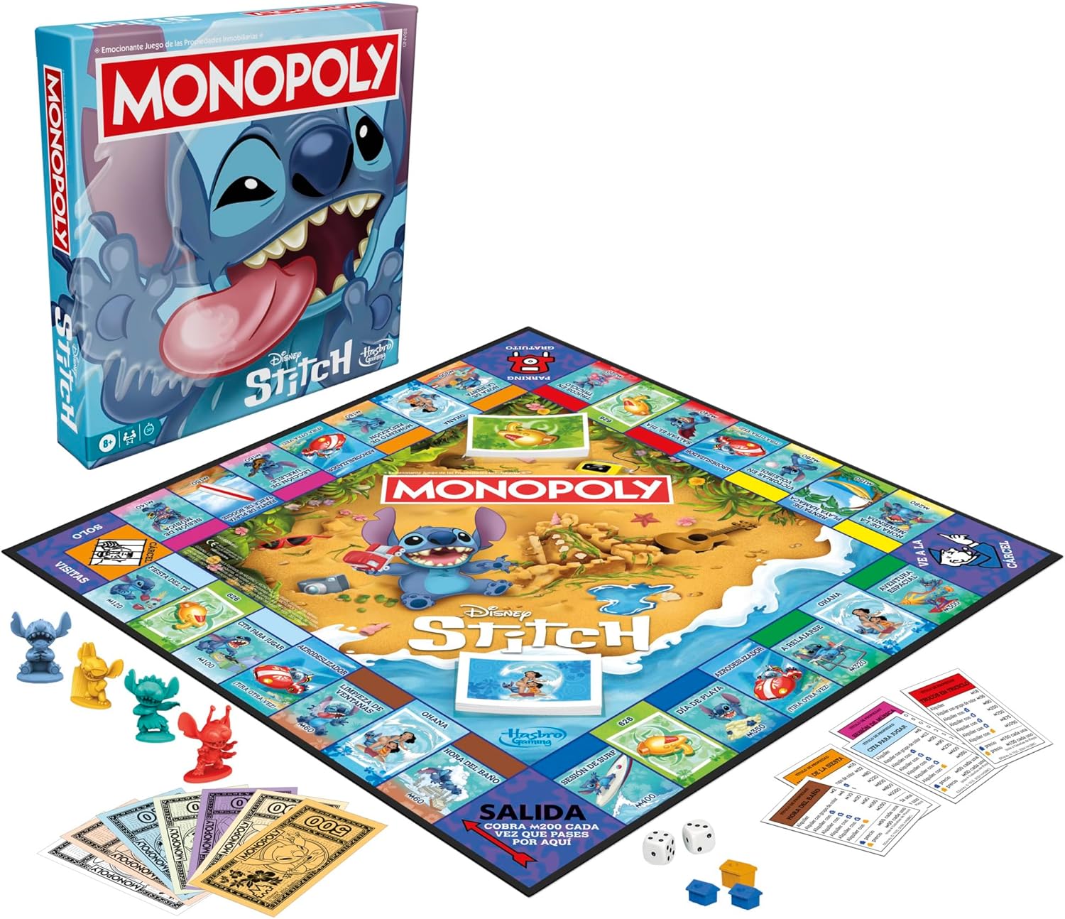 ¡Crea un día perfecto con Stitch en el juego de mesa Monopoly Edición Disney Stitch! En esta edición, las propiedades son remplazadas por actividades favoritas de Stitch, como un Espectáculo de Hula y Chillax, así como artículos de alquiler en la playa. Primero, cada jugador elige un peón único de Stitch. A continuación, recorre el tablero intentando reunir tantas actividades y artículos de alquiler en la playa como pueda. ¡Cuanto más reúna un jugador, más emocionante será su día con Stitch y más alquiler podrá cobrar a otros jugadores! Obtén un grupo de color para añadir Cabañas de Playa y Faros y poder cobrar todavía más alquiler. Roba cartas de 626 y de Ohana para llevar a cabo acciones que cambiarán el juego. ¡El último jugador que quede activo cuando todos hayan caído en bancarrota será el ganador! Este juego de mesa estratégico es una divertida opción para jugar en familia y es un excelente regalo para los niños, niñas, adolescentes y adultos que son fans de Stitch. Edad recomendada: A partir de 8 años. Copyright Disney. Los nombres y logotipos de Hasbro y Monopoly, el diseño distintivo del tablero, las cuatro casillas de las esquinas, el nombre y el personaje de Mr. Monopoly, así como cada uno de los elementos distintivos del tablero y piezas de juego, son marcas registradas de Hasbro, Inc. para su juego de las operaciones inmobiliarias y equipo del juego.