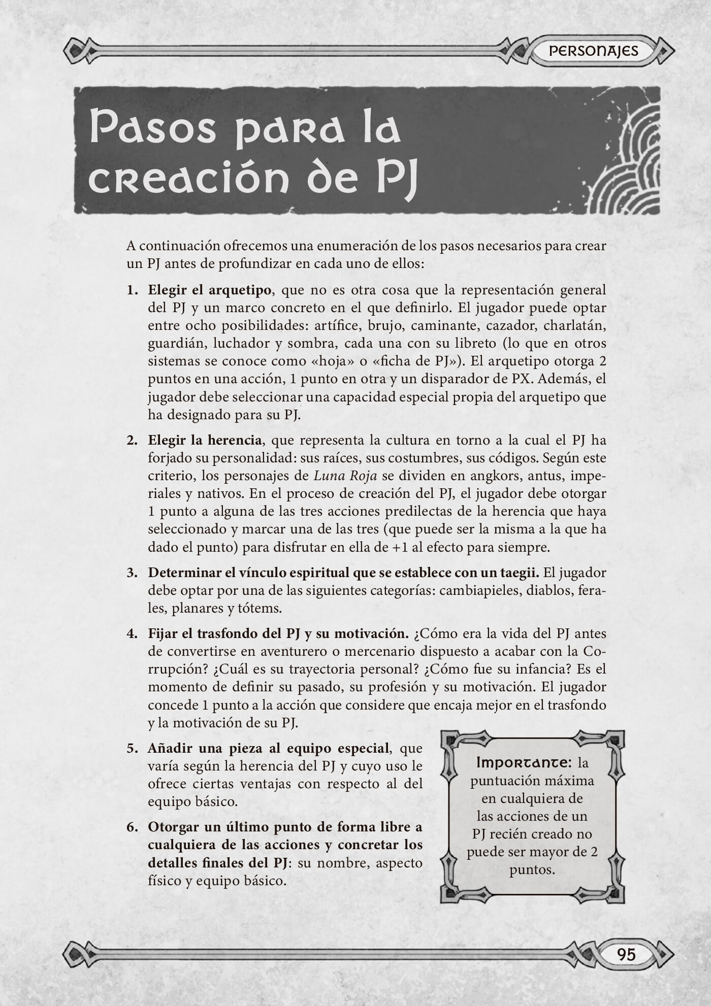 Bienvenido al apasionante mundo de Luna Roja, un juego de rol de fantasía oscura creado por Luis Montejano que destila el exotismo de grandes obras de la animación japonesa como La princesa Mononoke y lo combina con el ambiente oscuro y hasta grimdark de videojuegos como Diablo o The Witcher. En Luna Roja encontrarás un mundo primigenio donde las fuerzas telúricas de la naturaleza y la humanidad, que ya han luchado contra el avance de la civilización, el metal y el fuego, hacen frente ahora a horribles criaturas emanadas de la Corrupción en una tierra plagada de poderosos e incognoscibles espíritus, los taegii. Se trata de un mundo primitivo enfrentado a una terrible némesis en el que sus habitantes intentan sobrevivir en los últimos días del Gran Bosque, pero donde todavía queda espacio para el heroísmo y una tibia y pálida esperanza.